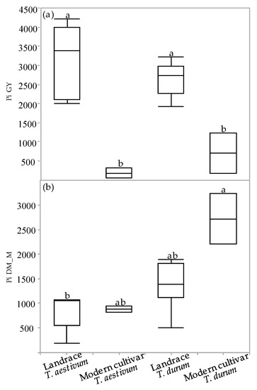 The superiority index (Pi) was used to assess cultivar general superiority across the various environmental field experiments. The Pi was calculated for GY and DM_M in all the environments for each of the four genotypic groups (Figure 5a,b). The Pi-GY values of the semidwarf modern cultivars (both durum and bread wheat) were significantly inferior relative to the landraces, indicating that modern cultivars are more stable and better adapted to varying environments (Figure 5a). Conversely, the Pi-DM_M values of both the bread wheat groups as well as of the durum landraces were inferior to the values of the modern durum cultivars. A significant difference in Pi-DM_M values was observed only between the bread wheat landraces and the modern durum cultivar group (Figure 5b).