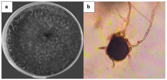 Cultural and morphological characteristics of M. phaseolina. (a) Colony on the agar plate; (b) microsclerotia (100×).