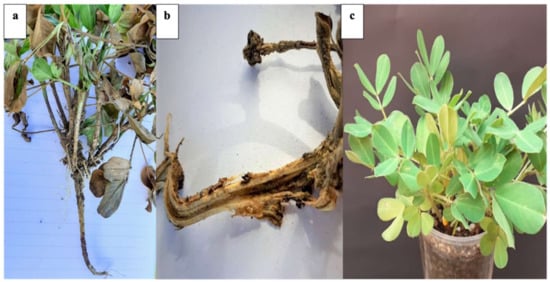 Pathogenicity tests with “PUE 4.0” strain: (a) plant of Arachis hypogea with charcoal rot and death of foliage at 20 days after inoculation; (b) cross-section of peanut root showing rot and the presence of microsclerotia; (c) control group without symptoms.