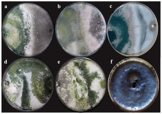 Antagonism of T. asperellum (a), T. harzianum native (b), T. hamatum (c), T. koningiopsis (d), and T. harzianum (e) with M. phaseolina on the scale by Bell et al. [34] after 132 h in dishes with PDA medium, incubated at 28 °C for 10 days. (d,e) Class I antagonism; (a–c) class II antagonism; (f) control group of M. phaseolina.
