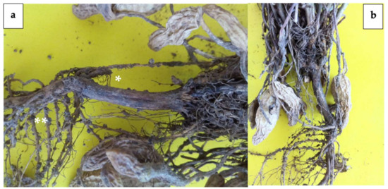 Charcoal rot in peanut plants that were inoculated with M. phaseolina. (a) reddish brown necrosis * present on the surface of the main root with abundant dark mycelium that formed black and rounded microsclerotia on the lateral roots **; (b) necrosis in peanut pods.