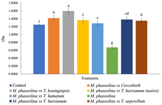 Of the different microbial antagonists used in the present investigation, T. koningiopsis (T-K11) and T. harzianum (native) showed more efficient results in reducing charcoal rot and the incidence of the disease. The same finding was found by Hussain [22] and Khan [53], who observed that T. harzianum is effective in controlling M. phaseolina for mung beans. Likewise, Dubey [54] observed that T. harzianum increased the frequency of healthy plants, results similar to those obtained in the present investigation by T. koningiopsis (T-K11), which managed to reduce the incidence of charcoal rot by 76% in the field.