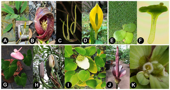 - Mayo, S.J.; Bogner, J.; Boyce, P.C. Araceae. In The Families and Genera of Vascular Plants; Kubitzki, K., Ed.; Springer: Berlin/Heidelberg, Germany, 1998; Volume 4, pp. 26–74. [Google Scholar]
