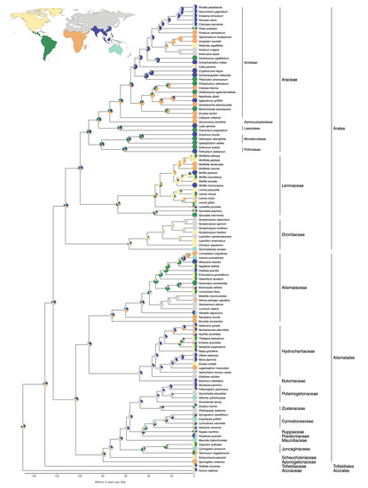 Phylogeny of Arales, constructed using combined DNA sequence data from five plastid regions (matK, ndhF, rbcL, rps16, and trnL-F). The tree represents a maximum likelihood tree, constructed in IQ-TREE [18] using default settings. Taxa were trimmed to include only one representative species for most genera. Branch lengths were adjusted to be ultrametric using the chronopl function in the R package ape [19], and the x-axis was scaled to approximate node ages that were reported previously [20]. Ancestral biogeography was reconstructed using the ace function in the ape package, to estimate the likelihood of an ancestor occupying one or more of the biogeographical realms indicated by the colored regions in the inset map. The ancestral likelihood values are shown as pie charts at the nodes of the phylogeny.