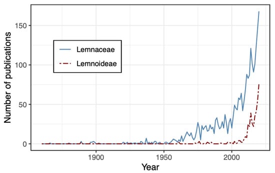 Usage of ‘Lemnaceae’ and ‘Lemnoideae’ in publications over time. Important events that may have influenced usage include the initial plastid data suggesting that duckweeds belong to the Araceae clade in 1995 [3] and the APG recommendation to include duckweeds in Araceae s.l., in 1998 [10]. Data were obtained from the Dimensions website (https://app.dimensions.ai/; accessed on 20 August 2021) by searching for each keyword anywhere in an article.