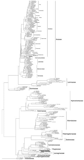 According to widely accepted phylogenetic analyses of plastid data, the sister lineage to Araceae s.l. is diverse and comprises several wholly aquatic lineages such as Hydrocharitaceae and Potamogetonaceae [20,65]. More distantly related to these, the family Tofieldiaceae resolves as the sister lineage of the clade containing Araceae, Hydrocharitaceae, and Potamogetonaceae.
