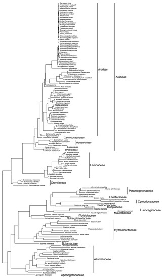 - Henriquez, C.L.; Arias, T.; Pires, J.C.; Croat, T.B.; Schaal, B.A. Phylogenomics of the plant family Araceae. Mol. Phylogenet. Evol. 2014, 75, 91–102. [Google Scholar] [CrossRef] [PubMed]