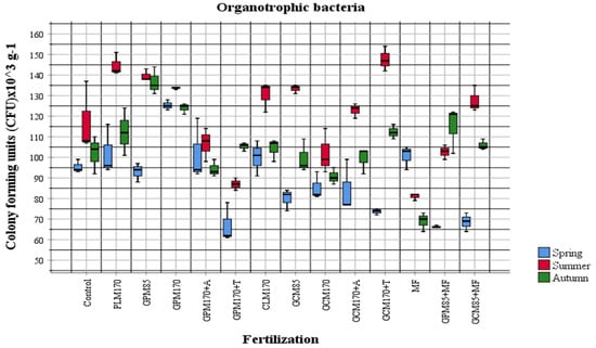 Studies by other authors have shown that fertilization with organic fertilizers initially increases the amount of ammonifiers (organotrophic bacteria), and later, especially at the end of the growing season, the amount of nitrifiers (mineral nitrogen-assimilating bacteria) increases [41]. Otherwise, if the abundance of nitrifiers is high in the spring, then nitrate depression is possible [42], while abundant mineral fertilization reduces the amount of nitrifiers.