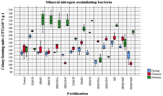 The data of our study demonstrate that mineral nitrogen-assimilating bacteria were most abundant in the MF-fertilized test field. Organotrophic bacteria were more abundant in the test field fertilized with granulated poultry manure, non-symbiotic diazotrophic bacteria in the granulated cattle manure combined with mineral fertilizers-fertilized field, and fungi in the MF-fertilized field.