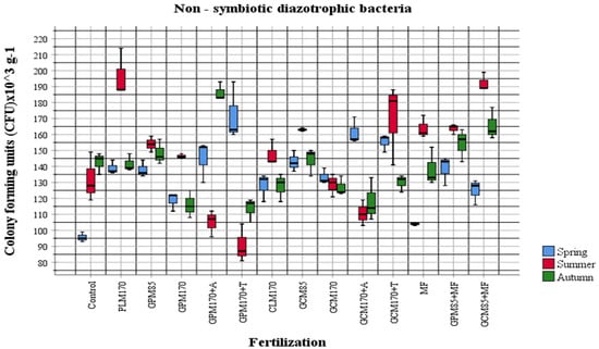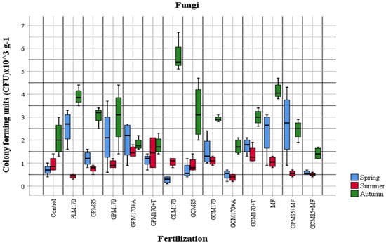 The results of our investigations showed that in general, the abundance of organotrophic bacteria was highest in the summer period. Comparing the data of individual samples with the control, we see that the proportion of organotrophic bacteria was increased in all samples fertilized with manure, except for the samples with Trichoderma and mineral fertilizers. As the manure was added in the autumn of 2018, an increase in organotrophs was to be expected, but the environmental conditions for active manure processing were not favorable. In both 2019 and 2020, temperatures were high, but a lack of moisture was felt. In the spring of 2020, dried manure was observed during tillage. The abundance of diazotrophs was different in different areas compared to the control variant (GPM170 + A, GPM170 + T) and showed a significant decrease during the summer (Figure 3). At that time, the amount of diazotrophs in the GPM + T sample was quite high in the spring (Figure 3). When manure is used for fertilization, an increase in organotrophs is usually observed first, followed by an increase in the abundance of nitrifiers, and an overall increase in soil activity is also observed [43,44]. Fertilization of manure also affects the taxonomic composition of microorganisms and increases the number of more active bacteria belonging to the taxonomic groups of Actinobacteria and Proteobacteria, which can grow in the nutrient medium [43,44,45]. In our studies, a significant increase in the abundance of nitrifiers was observed in samples fertilized with poultry manure in the autumn (Figure 1). The highest abundance of the fungal communities was also determined in autumn (2.87 ± 1.24 × 103 CFU g−1). During the summer period, the representatives of this group were determined to be the lowest (0.93 ± 0.44 × 103 CFU g−1). According to the microscopic and cultural features, predominant cultures strongly related to the genera Trichoderma, Paecilomyces, Cladosporium, Fusarium, Aureobasidium, Colletotrichum, Trichothecium, Penicillium, Saccharomyces, Mortierella, and Phiallophora were identified.