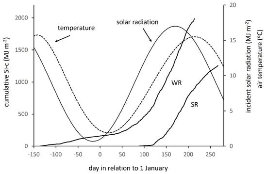 Representative annual waves of incident solar radiation and mean air temperature with growth period of typical winter (WR) and spring (SR) oilseed rape crops shown as cumulative solar radiation interception (Si-c) at Dundee UK, latitude 56.46° N, longitude 2.97° W.