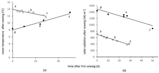 Air temperature (a), measured at the meteorological site, averaged over the first 30 d after sowing, and solar radiation accumulated during the early phase of growth (b) for winter (open square) and spring oilseed rape (closed square) subject to increasing delay in sowing after the first sown crops: with reference to exemplar sites used in Figure 3, letters a and d were the first sown, b and e intermediate, and c and f last sown.