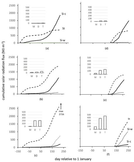 Examples of cumulative solar radiation (units MJ m−2) for sites identified in Figure 2 by letters a to f, designated as the earliest sown of winter (a) and spring (d) crops, intermediate (b,e) and the latest sown (c,f), showing solar radiation intercepted by the crop (Si-c, solid line), transmitted by the crop (St, heavy dashed line) and intercepted by the weeds (Si-w, fine dashed), also indicated on the extreme sites to aid interpretation. Inset graphs show weed dry matter (units g m−2) for monocot (M), dicot (D) and total (T) species.