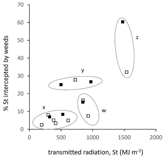 Transmitted radiation in principle sets the upper limit of radiation intercepted by the weeds, Si-w, but in all examples in Figure 3, Si-w was much lower than St. In winter crops, Si-w hardly increased before the winter due to very low weed cover after sowing, but then began to accumulate in spring from day 50 to 100. In spring crops, Si-w began to accumulate shortly after sowing, from around day 150. Some of the factors that determined low Si-w are revealed in Figure 4. A group of five winter and two spring sites (group x in Figure 4) developed high crop cover and hence low to moderate St (190–610 MJ m−2), but the weeds intercepted <10% of this St. All sites in this group were sown at or soon after the earliest date, and were given standard pre-sowing or pre-emergence herbicide treatment (see Materials and Methods). Weed populations at these sites had been rigorously suppressed soon after sowing to the point where they could not take advantage of the little transmitted radiation available. In contrast, three sites (group y in Figure 4) at which weed interception was a higher proportion, 25–30%, of St, were identified as having no or ineffective herbicide application. Two other sites (marked z in Figure 4), one winter and one spring, the latter intercepting 60% of the transmitted, were the latest sowings that produced very low crop cover that allowed weeds to expand almost unchecked (Figure 3c,f). No recorded agronomic influences could be attributed to the three other sites (group w).