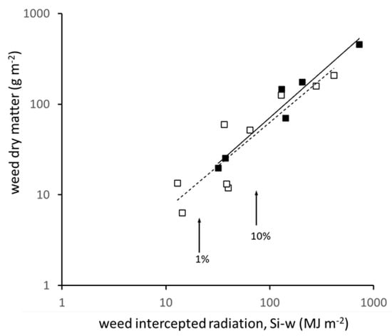 Weed dry matter and cumulative weed intercepted radiation (Si-w) up to the weed sample. Both axes are on a log scale to display the lower part of the range, for winter crops (dashed line, y = 0.74x0.96) and spring (solid line, y = 0.67x1.10), F. pr. > 0.001, %var 93% (non-log estimates given in text). Arrows show the calculation of Si-w for a weed cover of 1% and 10% between April and August under a mean daily solar income of 15.5 MJ m−2 and mean crop cover of 70%.