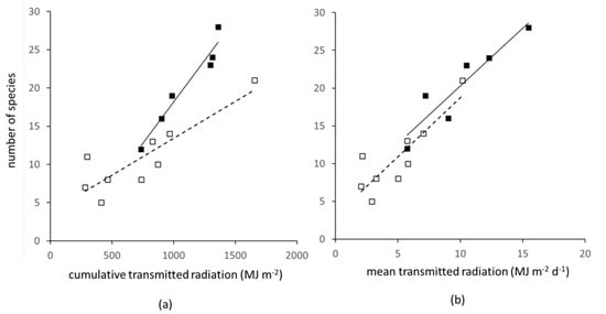 Weed growth occurred mainly in spring (Figure 3), as the incoming solar radiation began its annual rise. The precise timing of weed emergence and establishment was not measured, but preliminary analysis showed that the choice of starting date for accumulating or averaging St in winter crops made little difference to the result obtained, at least partly because of low incoming radiation for much of the winter period. Results are here presented for an arbitrary start at day 0 (1 January) for all winter sites, and day of sowing for all spring sites. The relation between transmitted radiation and species number was highly significant (F. pr. < 0.001) both when the total species count was used (73.8% var), or those species present at >0.1 g m−2 dry mass (89.9% var); the latter are shown in Figure 6a. When cumulative St was used (Figure 6a), spring sites extended to more species and had a steeper slope than winter sites. A possible reason for the difference in slope is that emergence and survival in winter crops were happening during a time of the year (early spring and summer) when incoming radiation was lower than in the corresponding period for spring crops. Accordingly, when transmitted radiation was expressed as an average per day, the relations for winter and spring became aligned (Figure 6b), implying that weed species number in both crop types was governed by a similar response to daily transmitted radiation.