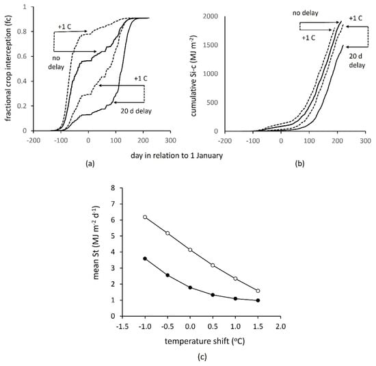 Estimated time courses of (a) fractional crop interception or cover and (b) cumulative solar energy interception based on conditions of the earliest sown winter crop (no delay) and the same crop subject to a 20-day delay in sowing, and both subject to a rise in daily temperature of 1 °C, with (c) resulting effects of temperature shift on mean transmitted radiation (St) during the main phase of weed growth (190 d from 1 January) in the earliest sown crop (closed circle) and the same crop subject to a 20-day delay (open circle).
