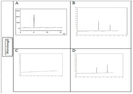 HPLC chromatograms obtained for (A) gibberellic acid content of Talaromyce pinophilus, (B) Triticum aestivum plants grown in sandy soil as control, (C) plants grown in a mixture of sandy soil 25% + sewage sludge 75% and (D) plants grown in a mixture of sandy soil 25% + sewage sludge 75% + T. pinophilus.