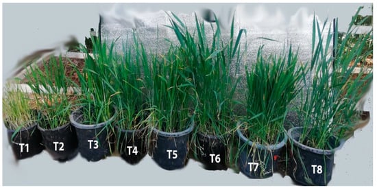 Triticum aestivum plants grown on mixtures of sandy soil and sewage sludge and the same treatment mixed with T. pinophilus. 100% sandy soil (T1), 75% sandy soil + 25% sewage sludge (T2), 50% sandy soil + 50% sewage sludge (T3), 25% sandy soil + 75% sewage sludge (T4), 100% sandy soil + T. pinophilus (T5), 75% sandy soil + 25% sewage sludge + T. pinophilus (T6), 50% sandy soil + 50% sewage sludge + T. pinophilus (T7), 25% sandy soil + 75% sewage sludge + T. pinophilus (T8).