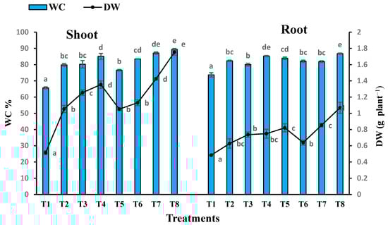 Water content (WC) and dry weight (DW) of shoot and root of T. aestivum plants grown on mixtures of sandy soil and sewage sludge and the same treatment mixed with T. pinophilus. 100% sandy soil (T1), 75% sandy soil + 25% sewage sludge (T2), 50% sandy soil + 50% sewage sludge (T3), 25% sandy soil + 75% sewage sludge (T4), 100% sandy soil + T. pinophilus (T5), 75% sandy soil + 25% sewage sludge + T. pinophilus (T6), 50% sandy soil + 50% sewage sludge + T. pinophilus (T7), 25% sandy soil + 75% sewage sludge + T. pinophilus (T8). Data are means ± SE, n = 3. Different letters indicate significant differences between treatments at p < 0.05 according to Duncan test.