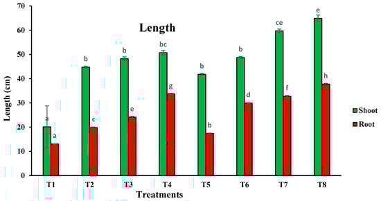 Length of shoot and root of T. aestivum plants grown on mixtures of sandy soil and sewage sludge and the same treatment mixed with with T. pinophilus. 100% sandy soil (T1), 75% sandy soil + 25% sewage sludge (T2), 50% sandy soil + 50% sewage sludge (T3), 25% sandy soil + 75% sewage sludge (T4), 100% sandy soil + T. pinophilus (T5), 75% sandy soil + 25% sewage sludge + T. pinophilus (T6), 50% sandy soil + 50% sewage sludge + T. pinophilus (T7), 25% sandy soil + 75% sewage sludge + T. pinophilus (T8). Data are means ± SE, n = 3. Different letters indicate significant differences between treatments at p < 0.05 according to Duncan test.