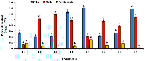 Chlorophyll (Chl) a, Chl b and carotenoids content in fresh leaves of Triticum aestivum plants grown on mixtures of sandy soil and sewage sludge and the same treatment mixed with T. pinophilus. 100% sandy soil (T1), 75% sandy soil + 25% sewage sludge (T2), 50% sandy soil + 50% sewage sludge (T3), 25% sandy soil + 75% sewage sludge (T4), 100% sandy soil + T. pinophilus (T5), 75% sandy soil + 25% sewage sludge + T. pinophilus (T6), 50% sandy soil + 50% sewage sludge + T. pinophilus (T7), 25% sandy soil + 75% sewage sludge + T. pinophilus (T8). Data are means ± SE, n = 3. Different letters indicate significant differences between treatments at p < 0.05 according to Duncan test. FW, fresh weight.