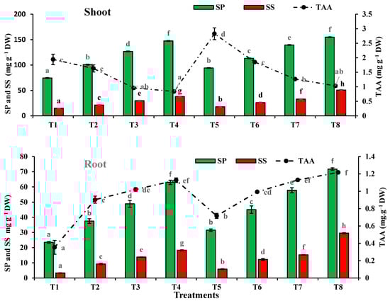 Soluble proteins (SP), soluble sugars (SS) and total amino acids (TAA) content in shoot and root of Triticum aestivum plants grown on mixtures of sandy soil and sewage sludge and the same treatment mixed with T. pinophilus. 100% sandy soil (T1), 75% sandy soil + 25% sewage sludge (T2), 50% sandy soil + 50% sewage sludge (T3), 25% sandy soil + 75% sewage sludge (T4), 100% sandy soil + T. pinophilus (T5), 75% sandy soil + 25% sewage sludge + T. pinophilus (T6), 50% sandy soil + 50% sewage sludge + T. pinophilus (T7), 25% sandy soil + 75% sewage sludge + T. pinophilus (T8). Data are means ± SE, n = 3. Different letters indicate significant differences between treatments at p < 0.05 according to Duncan test. DW, dry weight.