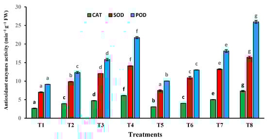 Catalase (CAT), superoxide dismutase (SOD) and peroxidase (POD) activity in fresh leaves of T. aestivum plants grown on mixtures of sandy soil and sewage sludge and the same treatment mixed with T. pinophilus. 100% sandy soil (T1), 75% sandy soil + 25% sewage sludge (T2), 50% sandy soil + 50% sewage sludge (T3), 25% sandy soil + 75% sewage sludge (T4), 100% sandy soil + T. pinophilus (T5), 75% sandy soil + 25% sewage sludge + T. pinophilus (T6), 50% sandy soil + 50% sewage sludge + T. pinophilus (T7), 25% sandy soil + 75% sewage sludge + T. pinophilus (T8). Data are means ± SE, n = 3. Different letters indicate significant differences between treatments at p < 0.05 according to Duncan test. FW, fresh weight.