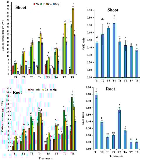 Cations content and Na/K ratio in shoot and root of Triticum aestivum plants grown on mixtures of sandy soil and sewage sludge and the same treatment mixed with T. pinophilus. 100% sandy soil (T1), 75% sandy soil + 25% sewage sludge (T2), 50% sandy soil + 50% sewage sludge (T3), 25% sandy soil + 75% sewage sludge (T4), 100% sandy soil + T. pinophilus (T5), 75% sandy soil + 25% sewage sludge + T. pinophilus (T6), 50% sandy soil + 50% sewage sludge + T. pinophilus (T7), 25% sandy soil + 75% sewage sludge + T. pinophilus (T8). Data are means ± SE, n = 3. Different letters indicate significant differences between treatments at p < 0.05 according to Duncan test. DW, dry weight.