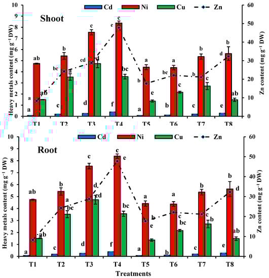 Heavy metals content in shoot and root of T. aestivumplants grown on mixtures of sandy soil and sewage sludge and the same treatment mixed with T. pinophilus. 100% sandy soil (T1), 75% sandy soil + 25% sewage sludge (T2), 50% sandy soil + 50% sewage sludge (T3), 25% sandy soil + 75% sewage sludge (T4), 100% sandy soil + T. pinophilus (T5), 75% sandy soil + 25% sewage sludge + T. pinophilus (T6), 50% sandy soil + 50% sewage sludge + T. pinophilus (T7), 25% sandy soil + 75% sewage sludge + T. pinophilus (T8). Data are means ± SE, n = 3. Different letters indicate significant differences between treatments at p < 0.05 according to Duncan test. DW, dry weight.