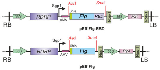To obtain the viral vector pEff-Flg-RBD allowing expression of the Flg-RBD protein, the corresponding fusion gene was cloned in the pEff vector (Figure 1). Recombinant vector pEff-Flg for the expression of flagellin without RBD was constructed in a similar way (Figure 1). Vectors pEff-Flg-RBD and pEff-Flg were transfected into A. tumefaciens GV310 and the resulting agrobacterium cultures were used for the infiltration of the leaves of N. benthamiana.