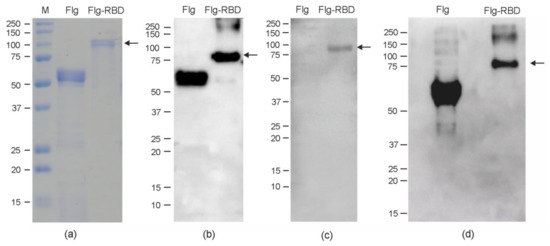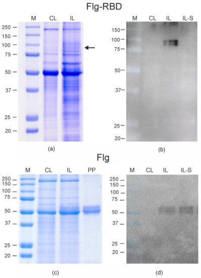 Samples of purified Flg-RBD and Flg proteins were characterized using SDS-PAGE and Western blotting (Figure 3). The data shown in Figure 3 demonstrates that both proteins were purified. Both Flg-RBD and Flg were specifically revealed in Western blot analysis with the antibodies to flagellin and hexahistidine tag, while only Flg-RBD was detected with the monoclonal antibodies against the RBD.