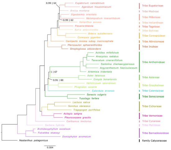 The availability of NGS data for an increasing number of species has hugely contributed to our understanding of the evolutionary relationships among organisms. Including data of 36 species from 19 tribes and 5 subfamilies of Asteraceae, this study represents the most comprehensive phylogenomic reconstruction using whole-plastome data obtained to date in this family (114 loci, 70,000 nt). Previous phylogenetic works had also approached the evolution of this huge and complex family, among the most relevant: (1) a meta-tree analysis combining results at lower taxonomic levels from several research works, based on 10 plastid DNA and one nuclear DNA marker (ITS) [1] and representing all tribes and subfamilies; (2) a phylogenetic inference based on 12 plastid markers representing 13 subfamilies and 40 tribes (17,319 nt) [16]; (3) an exhaustive phylogenomic study based on target sequence capture of 763 nuclear loci representing 13 subfamilies and 45 tribes (269,585 nt) [17]; and (4) a phylotranscriptomic analysis with data from 243 species (13 subfamilies and 41 tribes) within the family [49].