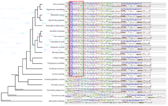 Repetitive sequences play an important role in plastome rearrangements and could be useful to understand the evolution of plant species and sequence divergence [44]. The two main repeated motifs in plastomes are microsatellites and dispersed repeats [45]. The microsatellite data reported in our study can be useful as potential markers for evolutionary and genetic population analyses of Asteraceae [46,47]. Our results suggest that there are no relevant differences in the proportion of tandem repeats between tribes, and microsatellites are also in the expected range found in other studies, such as [45] (91 to 94 microsatellites in Chaenomeles), ref. [39] (172 microsatellites in Hagenia) and [48] (116 microsatellites in Rubus).