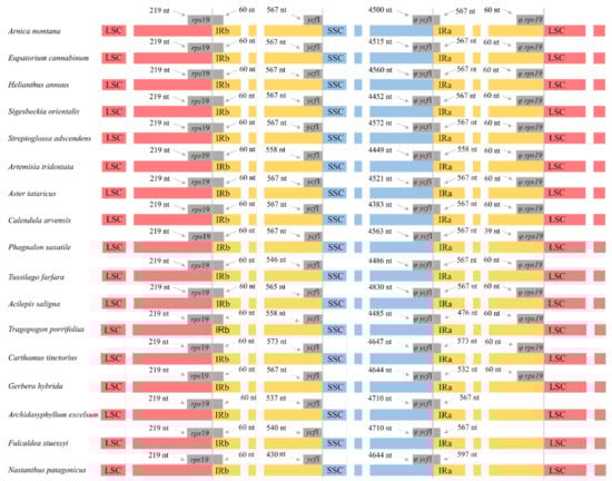 Comparison of the boundaries of the LSC, SSC and IR regions of a subset of 17 species from families Asteraceae and Calyceraceae (Nastanthus patagonicus). Genes suffixed with a phi (φ) are potential pseudogenes.