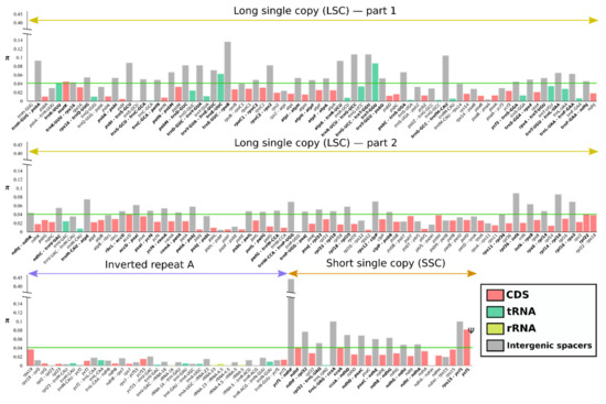 For the entire plastid genomes, the IR regions (IRA π = 0.00768, IRB π = 0.00791) were more conserved than both the LSC (π = 0.03611) and the SSC (π = 0.05974). Both IRs recovered the same nucleotide diversity for almost all genes, being mirror images one of the other. Regarding the different genomic regions analyzed in this study, the tRNA and the rRNA were the regions with lower nucleotide diversity (tRNA π = 0.01558, rRNA π = 0.00109), followed by the CDS (π = 0.02238) and the intergenic spacers (π = 0.04971).