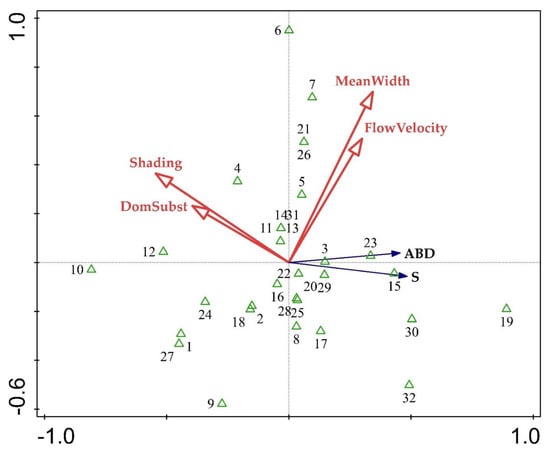 - Rambaud, M.; Combroux, I.; Haury, J.; Moret, J.; Machon, N.; Zavodna, M.; Pavoine, S. Relationships between channelization structures, environmental characteristics, and plant communities in four French streams in the Seine–Normandy catchment. J. N. Am. Benthol. Soc. 2009, 28, 596–610. [Google Scholar] [CrossRef]