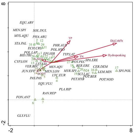 4.4. Analysis of Aquatic Macrophytes, Stressors and Their Relation