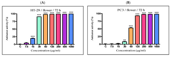 In vitro antiproliferative activity of ethanol extracts from three plant parts of K. paniculata. MTT assay was performed after 72 h. (A,C,E) show data for antiproliferative activity on cell line HT-29, of flower, leaf, and bark, respectively. (B,D,F) indicate results obtained on cell line PC3, of the same plant parts respectively. All samples were analyzed in triplicates. Values are represented as mean ± SD; One-way ANOVA followed by post hoc test using Tukey’s multi-group comparison was performed: * p < 0.05, ** p < 0.01, *** p < 0.001.