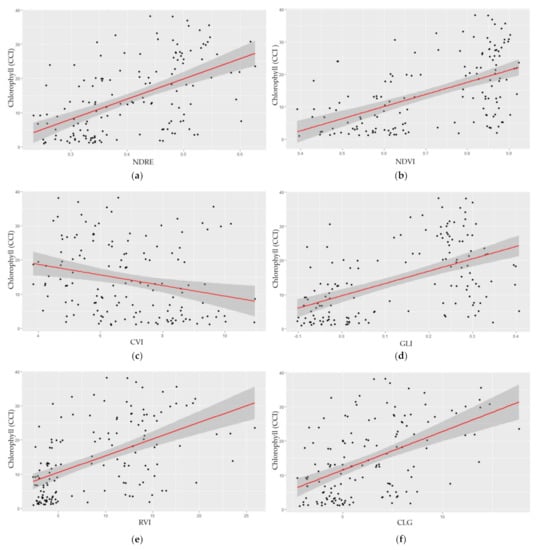 It should be noted that the Pearson correlation (r) between CVI and chlorophyll content was negative, whereas all the other six indices showed a positive correlation, although the Pearson correlation is weak (−0.2433). This can be explained from the index, in Equation (5), CVI = NIR × Red/(Green × Green), the green band is given a higher weight. Higher chlorophyll induces higher reflectance in the green band, rendering a lower CVI value.