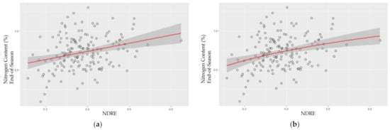 The vegetation index sensitivity was vastly different for nitrogen and lignin content modeling compared with that of chlorophyll content and rust disease incidence. At the end-of-season, both of these statistics were very low, although NDRE outperformed NDVI slightly (R-squared 0.0521 vs. 0.0428). However, at mid-season, neither vegetation index was effective. This can be explained by the results from the chlorophyll content modeling. As it is reported that nitrogen content is positively correlated with chlorophyll content [50,51], NDVI is prone to oversaturate toward the end-of-season [35,36,37], which means that the sensitivity of the NDVI index will be affected, causing the accuracy to drop significantly.