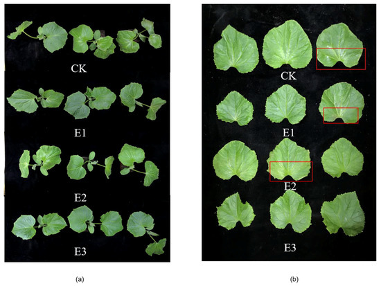 As can be seen in Figure 1, after 72 h of low-temperature stress, the cucumber leaves (the first) appeared dehydrated and wilted after the water control (CK), and the leaf edge was seriously dehydrated and curled upward. Compared with CK, the symptoms of E1 and E2 were alleviated, and the leaves of E3 did not appear to be wilting. The overall comparison of low-temperature stress protection was E3 > E1 > E2 > CK.