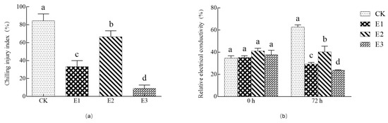 Effects of single and compound treatments on chilling injury index (a) and relative electrical conductivity (b) of leaves under low-temperature stress. Different small letters indicate significant difference among treatments at the 0.05 level (n = 3, p < 0.05).
