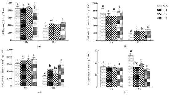 Superoxide dismutase (SOD) and catalase (CAT) scavenge free radicals and can protect cell membranes from toxicity. These enzyme activities directly reflect the adaptability of cells to stress, which is positively correlated with cold resistance. The leaves of cucumber seedlings were sprayed with (E1) 25 mg/L ABA, (E2) 1000 mg/L CaCl2, and (E3) combined 35 mg/L ABA + 500 mg/L CaCl2 solution (Figure 3a,b). The results show that when the cucumber seedlings were treated with low temperature for 72 h, the SOD enzyme activity of E1, E2, and E3 treatments was significantly increased (26.32%, 17.46%, and 34.47%, respectively) (p < 0.05) compared with those of CK. At the same time, compared with CK, the CAT activity of E1, E2, and E3 treatments was significantly increased by 41.20%, 32.15%, and 59.66%, respectively (p < 0.05), and the enzyme activity of the E3 treatment was significantly higher than that of other treatments. Ascorbate peroxidase (APX) can effectively reduce the accumulation of reactive oxygen species and reduce cell membrane damage. After 72 h of low-temperature treatment, compared with CK, the APX activities of E1, E2, and E3 treatments increased by 70.93%, 32.80%, and 118.80%, respectively (p < 0.05) (Figure 3c). Single treatment and combined treatment can increase the activity of an active oxygen scavenging enzyme, but the compound treatment E3 had the largest effect. At the same time, compared with CK, the malondialdehyde (MDA) content in E1-, E2-, and E3-treated seedlings decreased by 36.30%, 28.71%, and 44.55%, respectively (p < 0.05) (Figure 3d), and the E3 treatment was again the best. In summary, E3 treatment increased the antioxidant enzyme activity and APX activity of cucumber seedlings under low-temperature stress, and effectively eliminated the accumulation of MDA content, indicating that E3 treatment had the best effect on improving the low-temperature resistance of cucumber seedlings.