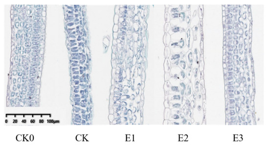 Figure 4 shows the cross-section of cucumber leaves. The cells of the adaxial palisade tissue treated with CK0 were long and neatly arranged, with a thickness of 16.56~23.25 μm. Compared with CK, the leaf thickness (transverse section) of cucumber seedlings for the three treatments was significantly increased. The E1-treated palisade tissue cells are tightly arranged, and sponge tissue cells are arranged loosely and irregularly, with a thickness of 14.89~21.88 μm. The palisade cells and sponge tissue cells treated with E2 were loosely arranged. The shape of sponge tissue cells were mostly long columnar, irregular, and the intercellular space was large. The thickness was between 22.96 and 28.17 μm. Increased intercellular space speeds up water loss. Compared with E1 and E2, the upper and lower epidermal cells, palisade cells, and spongy tissue cells of E3 treatment were neatly arranged, closely structured, clearly visible, and the overall shape was more regular.