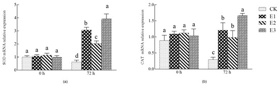 As shown in Figure 5, the gene expression of SOD and CAT decreased significantly after 72 h of low-temperature stress (p < 0.05). Compared with the water control, E1, E2, and E3 treatments significantly increased the gene expression of SOD and CAT (p < 0.05), and the gene expression of SOD and CAT in E3 treatment was significantly higher than that of the E1 and E2 treatments (p < 0.05). Again, the E3 treatment had the best effect, indicating that (under cold stress conditions) the combination of ABA and CaCl2 can increase the expression of antioxidant enzyme genes, alleviate seedling injury, and improve cold resistance.