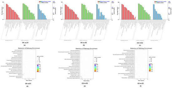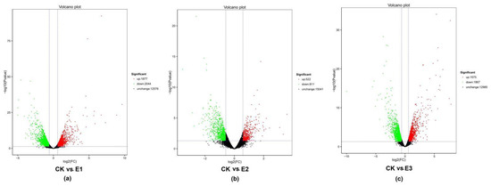 According to the value of FPKM (Fragments per kbp of transcript sequence per mbp sequencing) to reflect the expression of genes, the p-value < 0.05 and |log2 Fold Change| > 1.5 were used as screening criteria to obtain differentially expressed genes. The statistical results showed that there were 3921 differential expression genes in CK vs. E1, of which 1877 were upregulated and 2044 were downregulated (Figure 6a). CK vs. E2 had 1333 differentially expressed genes, of which 522 were upregulated and 811 were downregulated (Figure 6b). There were 3442 differential expression genes in CK vs. E3, of which 1575 were upregulated and 1867 were downregulated (Figure 6c). In general, the number of downregulated genes was higher than the upregulated genes for all treatments.