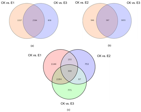 Analyses of differentially expressed genes in E1 and E3 were compared with CK. There were 1337 genes differentially expressed in E1, and 858 genes differentially expressed in E3. There were 2584 differentially expressed genes in E1 and E3, of which 1178 were upregulated and 1406 were downregulated (Figure 7a). Additionally, differentially expressed genes in E2 and E3 compared with CK were analyzed. There were 946 genes differentially expressed in E2, and 3055 in E3. There were 387 differentially expressed genes in E2 and E3, of which 60 were upregulated and 189 were downregulated (Figure 7b). The differentially expressed genes in E1, E2, and E3 compared with CK were analyzed. There were 1144 differentially expressed genes in E1, 753 differentially expressed genes in E2, and 771 differentially expressed genes in E3. There were 300 differentially expressed genes in E1, E2, and E3, of which 55 were upregulated and 143 were downregulated (Figure 7c).