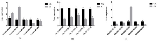 The qRT-PCR validation of differentially expressed genes. (a) CK vs. E1-related differential gene expression. (b) CK vs. E2-related differential gene expression. (c) CK vs. E3-related differential gene expression. (n = 3).