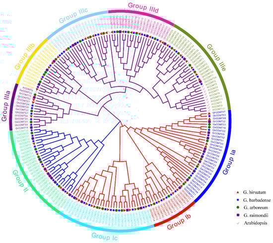 Phylogenetic analysis and subfamily classification of the COMT genes in Arabidopsis (AtCOMT), G. hirsutum(GhCOMT), G. barbadense(GbCOMT), G. arboreum(GaCOMT) and G. raimondii (GrCOMT). The phylogenetic tree was constructed with MEGA 6.0 using the neighbor-joining model with 1000 bootstrap replicates. All 190 COMTs were divided into nine subgroups, which were highlighted by different colors.